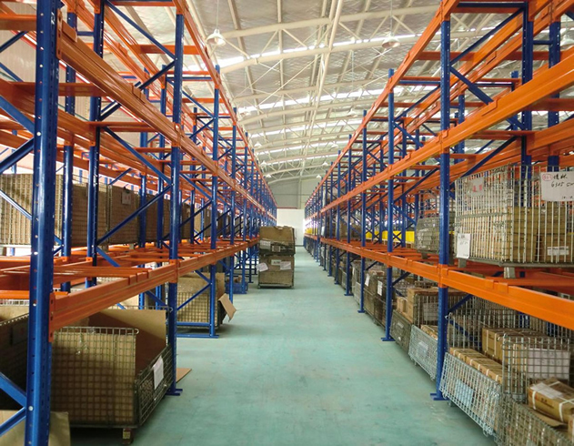 货窄巷式货架=重型横梁货架+叉车行动导轨;加上导轨,配合三向堆垛车应用。
