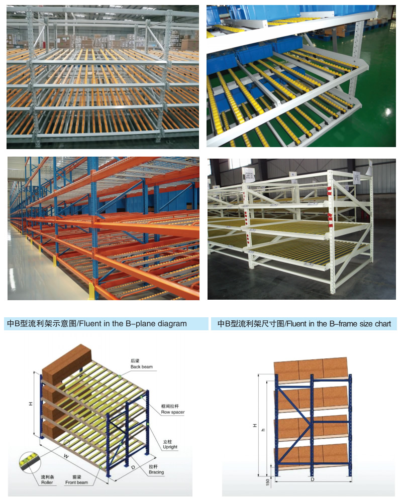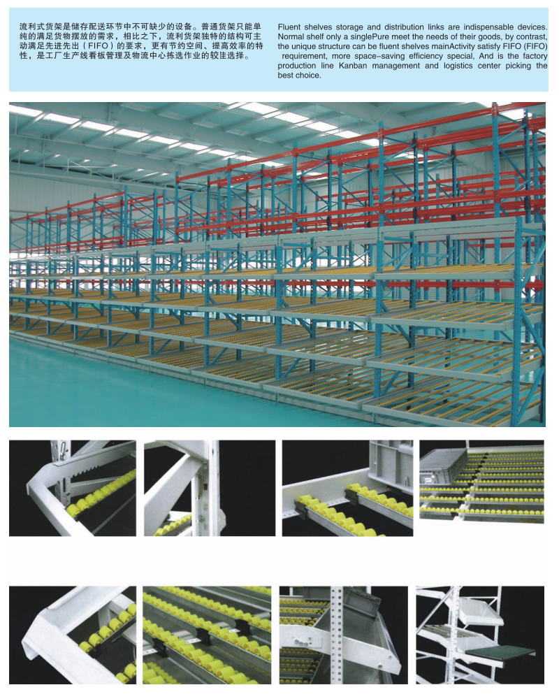 流利式货架又称滑移式货架,采用辊轮铝合金,钣金等流利条,利用货物台架的自重,从一边通道存货,另一边通道取货实现先进先出,存储方便,以及一次补货多次取货。流利货架是存储配送环节中不可缺少的设备,普通货架只能单纯的满足货物摆放的需求,相比之下,流利式货架的独特结构可主动满足先进先出的要求。货架结构特点:流利式货架根据组成货架的基本框架的材质可分为重型流利式货架和中B型流利式货架。流利货架的流利条直接连接到前后横梁及中间支撑梁上,横梁直接挂在支柱上,流利条安装倾斜度取于货箱的尺寸、重量以及流利架的深度,通常取5%~9%。当滚道较长时,可用分隔板将滚道隔开。取货端需安装制动片使货物减,降低冲击。货架特点:1、流利式货架可以满足货物先进先出的要求,利用货物的自重,一边存货,从另一边取货;2、由于货架的结构特点,使得货物存储方便,还可以一次补货多次取货;3、流利货架能够节约空间,提高效率,适合大量货物的存放和拣选;4、可配电子标签,实现货物的轻松管理。使用领域:流利式货架广泛应用于制造业,商业,配送中心,装配车间以及出货频率较高的仓库流利式货架:采用辊轮铝合金,钣金等流利条,利用台架自重实现先进先出,存储方便,适用于装配线两侧配送中心等场所。