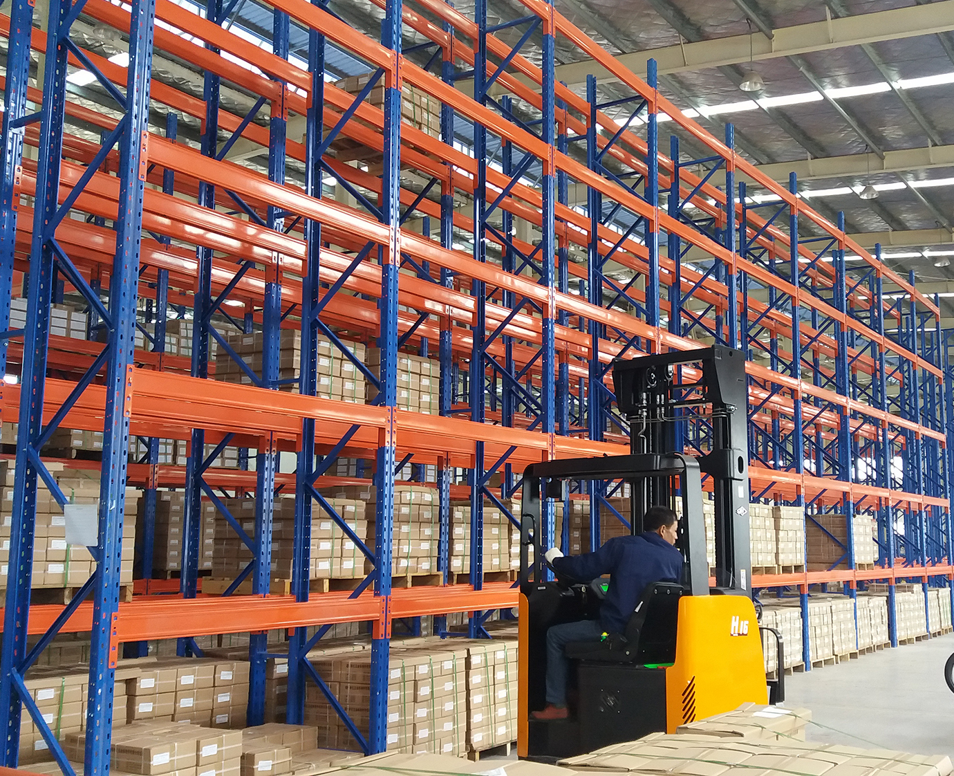 重型横梁式货架是目前使用应用广泛的货架类型之一,具有较强的通用性,可适应各种类型的货物,可按货物尺寸要求调解横梁高度。重型横梁式货架主要由立柱、横梁、横撑、斜撑以及自锁螺栓组装而成。横梁与立柱的连接多采用机械式的锁扣结构,可随意拆装组合。横梁采用特制的冷轧P型闭口梁;该结构具有简单可靠、重量轻、承载力强、造价低的特点;柱卡与立柱连接时配有特殊设计安全销,可以确保横梁在外力撞击下不会脱落。可根据存储单元集装设备的特性加装如:隔档、钢层板(木层板)、金属丝网层、仓储笼导轨、油桶架等功能性附件。根据用户实际使用情况:托盘载重要求、托盘尺寸、仓库实际空间、叉车实际提升高度,可提供不同规格的横梁式重型货架以供客户选择。