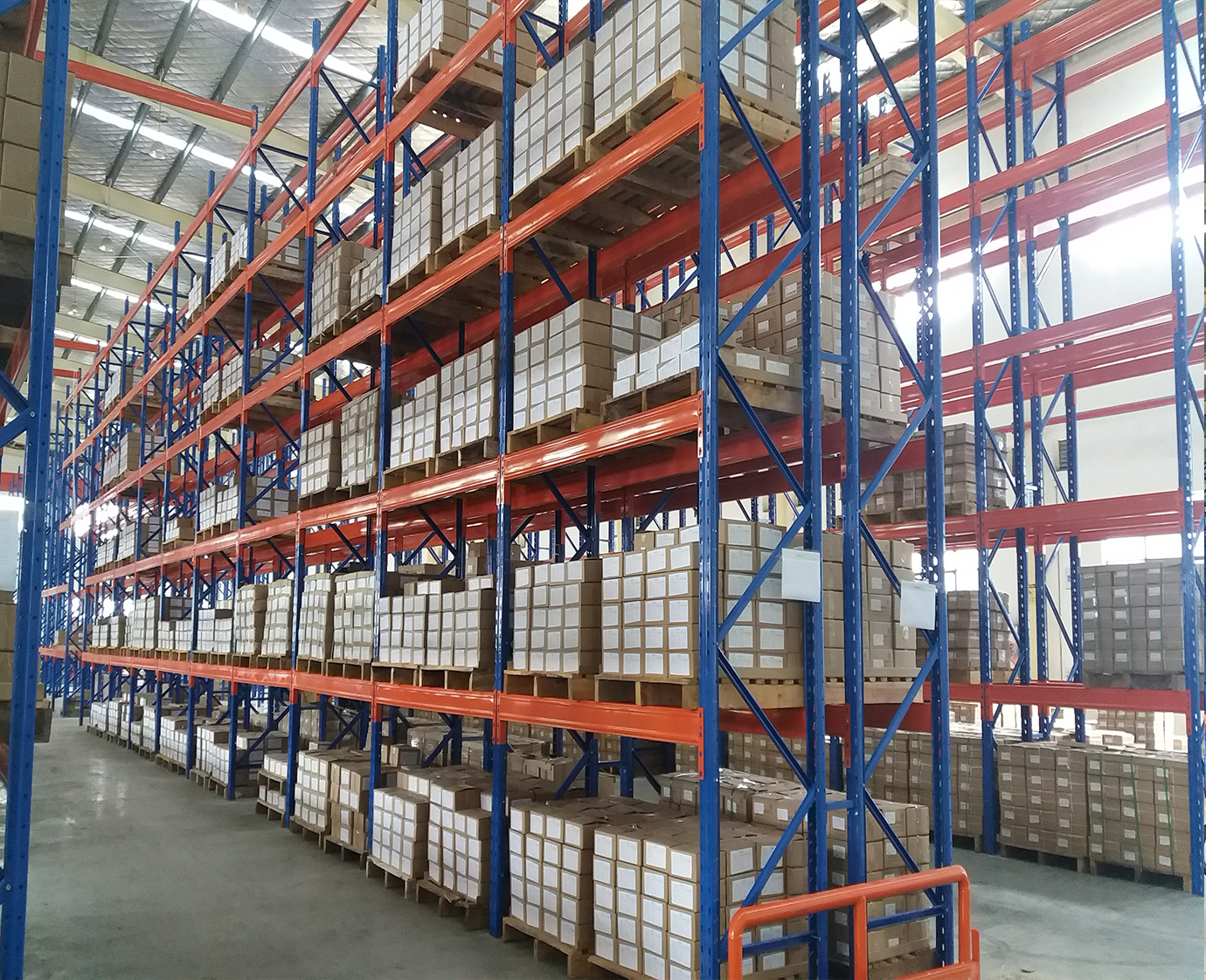 重型横梁式货架是目前使用应用广泛的货架类型之一,具有较强的通用性,可适应各种类型的货物,可按货物尺寸要求调解横梁高度。重型横梁式货架主要由立柱、横梁、横撑、斜撑以及自锁螺栓组装而成。横梁与立柱的连接多采用机械式的锁扣结构,可随意拆装组合。横梁采用特制的冷轧P型闭口梁;该结构具有简单可靠、重量轻、承载力强、造价低的特点;柱卡与立柱连接时配有特殊设计安全销,可以确保横梁在外力撞击下不会脱落。可根据存储单元集装设备的特性加装如:隔档、钢层板(木层板)、金属丝网层、仓储笼导轨、油桶架等功能性附件。根据用户实际使用情况:托盘载重要求、托盘尺寸、仓库实际空间、叉车实际提升高度,可提供不同规格的横梁式重型货架以供客户选择。